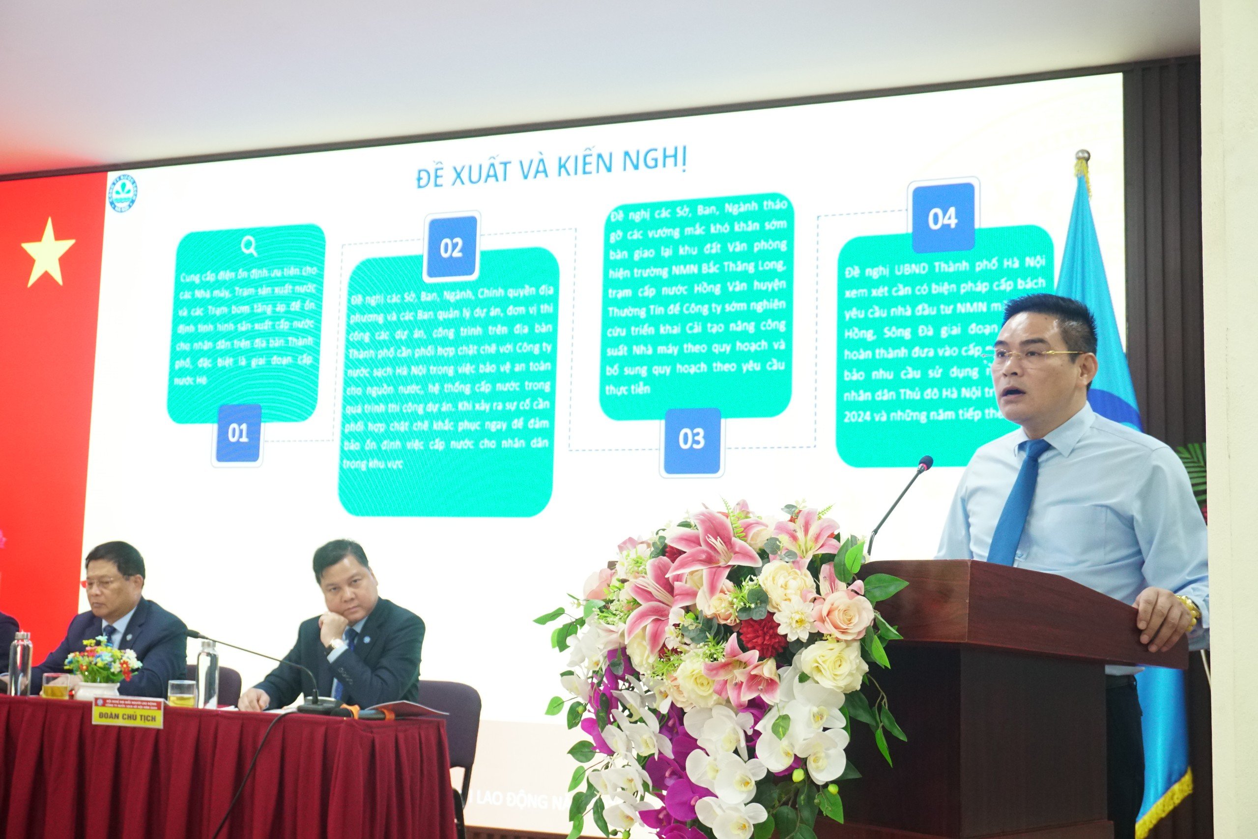 Về phía Công ty Nước sạch Hà Nội có ông Nguyễn Bảo Vinh, Bí thư Đảng ủy, Chủ tịch Hội đồng thành viên; Ông Trần Quốc Hùng, Phó Bí thư Đảng ủy, Tổng Giám đốc Công ty; Ông Trương Tiến Hưng, Phó Tổng Giám đốc, Chủ tịch Công đoàn Công ty; Bà Trần Thu Trang, Bí thư Đoàn Thanh niên Công ty. Cùng các ông/bà đại biểu đương nhiên Công ty, Hội đồng thành viên, Ban Tổng Giám đốc, Kiểm soát viên, Kế toán trưởng, Ban chấp hành Công đoàn, Trưởng Ban thanh tra nhân dân Công ty và 226 đại biểu đại diện từ các đơn vị, Công ty thành viên.