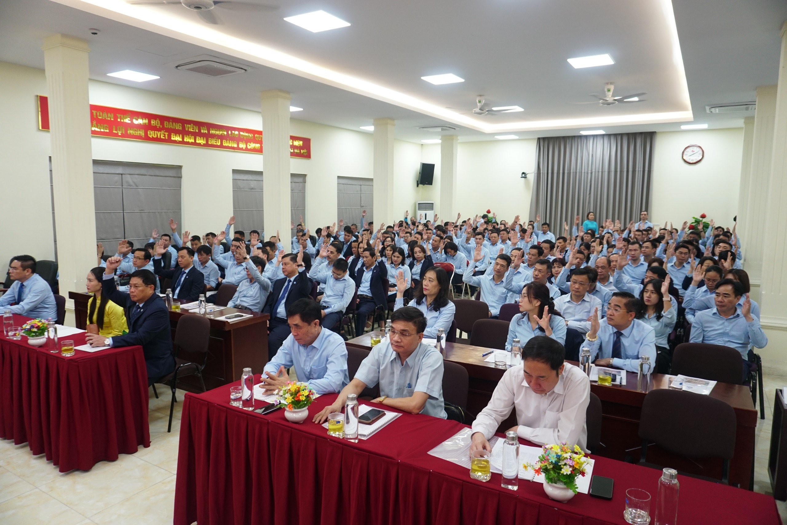 Kết thúc Hội nghị 100% đại biểu đã nhất trí thông qua Nghị quyết Hội nghị đại biểu người lao động Công ty năm 2024 và biểu quyết thống nhất thông quan phương án Hiệp thương tập thể làm việc 40h/tuần toàn Công ty để thực hiện từ tháng 5/2024, khẳng định tinh thần đoàn kết, nhất trí cao thực hiện thắng lợi nhiệm vụ chính trị của Thành Ủy, Hội đồng Nhân dân, Ủy ban Nhân dân Thành phố giao.