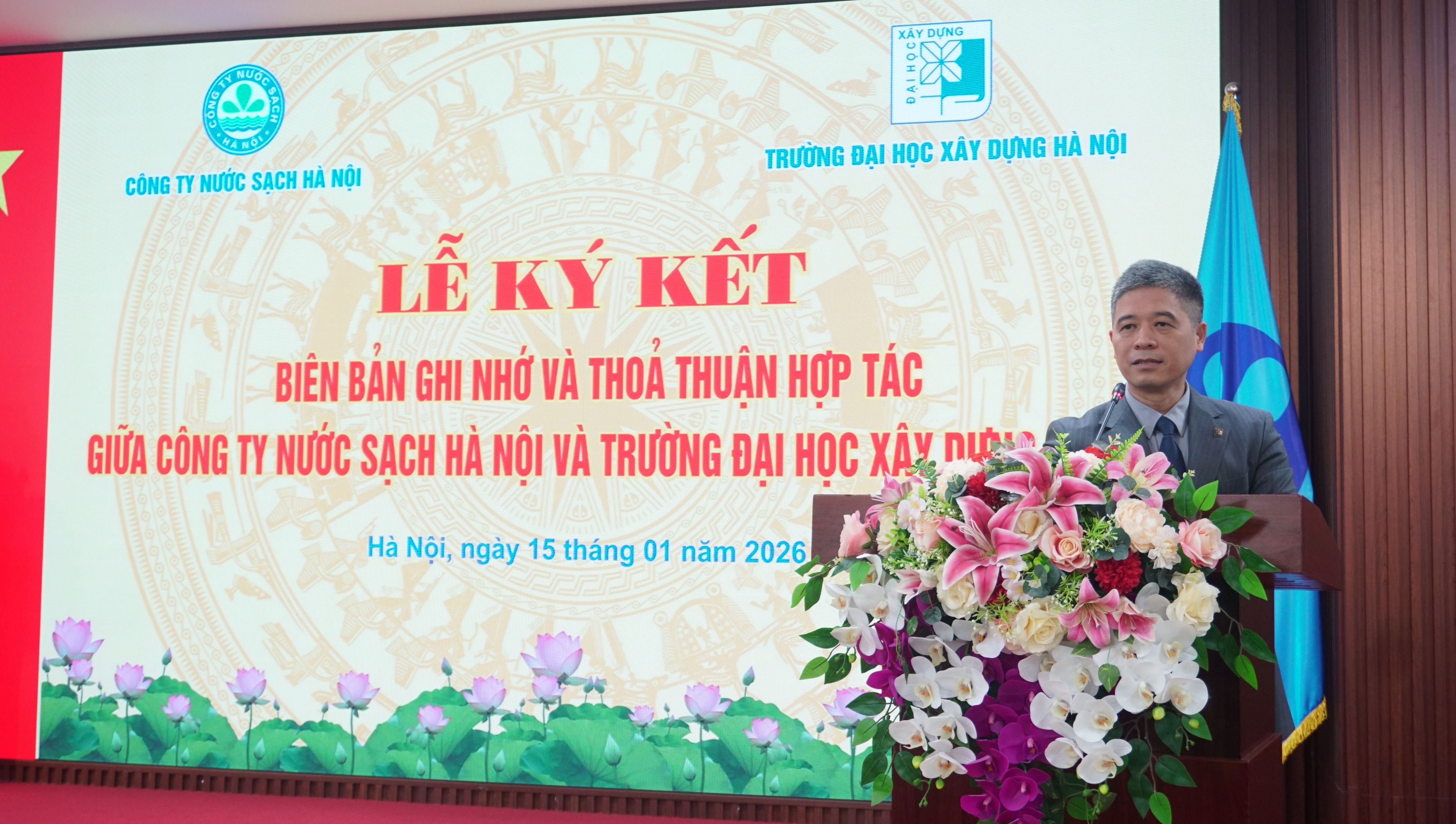Sáng ngày 15/1/2026, Công ty NSHN đã tổ chức Lễ ký kết biên bản ghi nhớ và thỏa thuận hợp tác giữa Công ty NSHN và trường Đại học Xây dựng. Đây là cơ hội tăng cường công tác gắn kết trong đào tạo, nghiên cứu khoa học, nghiên cứu ứng dụng sản xuất thực tiễn, tư vấn phát triển ứng dụng khoa học công nghệ và chuyển đổi số trong lĩnh vực cấp nước phục vụ trực tiếp hoạt động sản xuất – kinh doanh của Công ty Nước sạch Hà Nội.