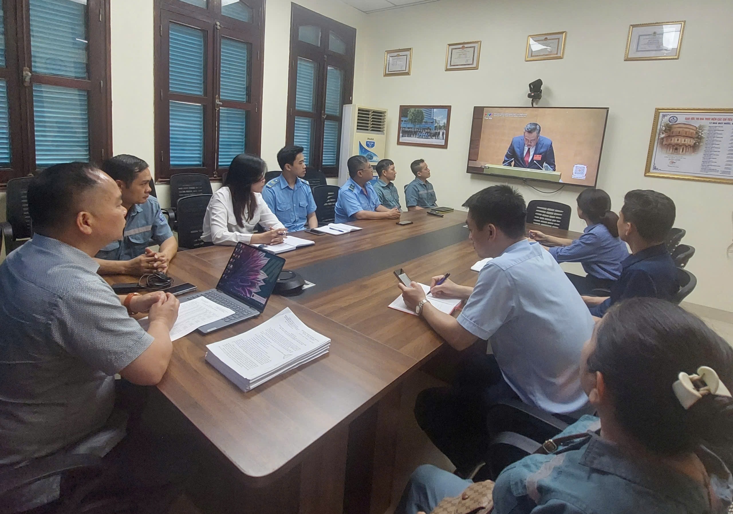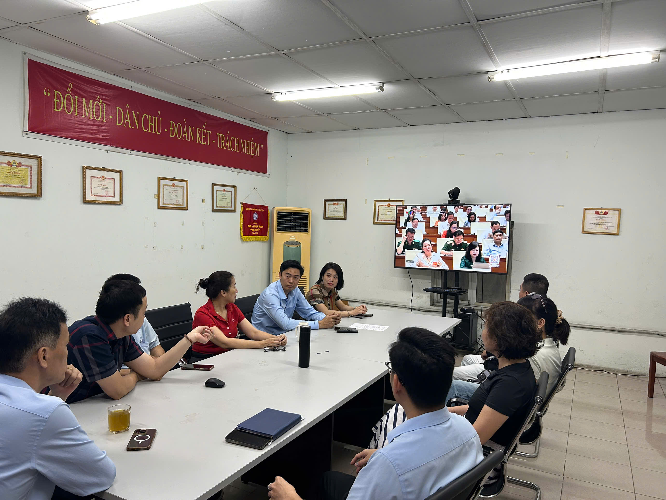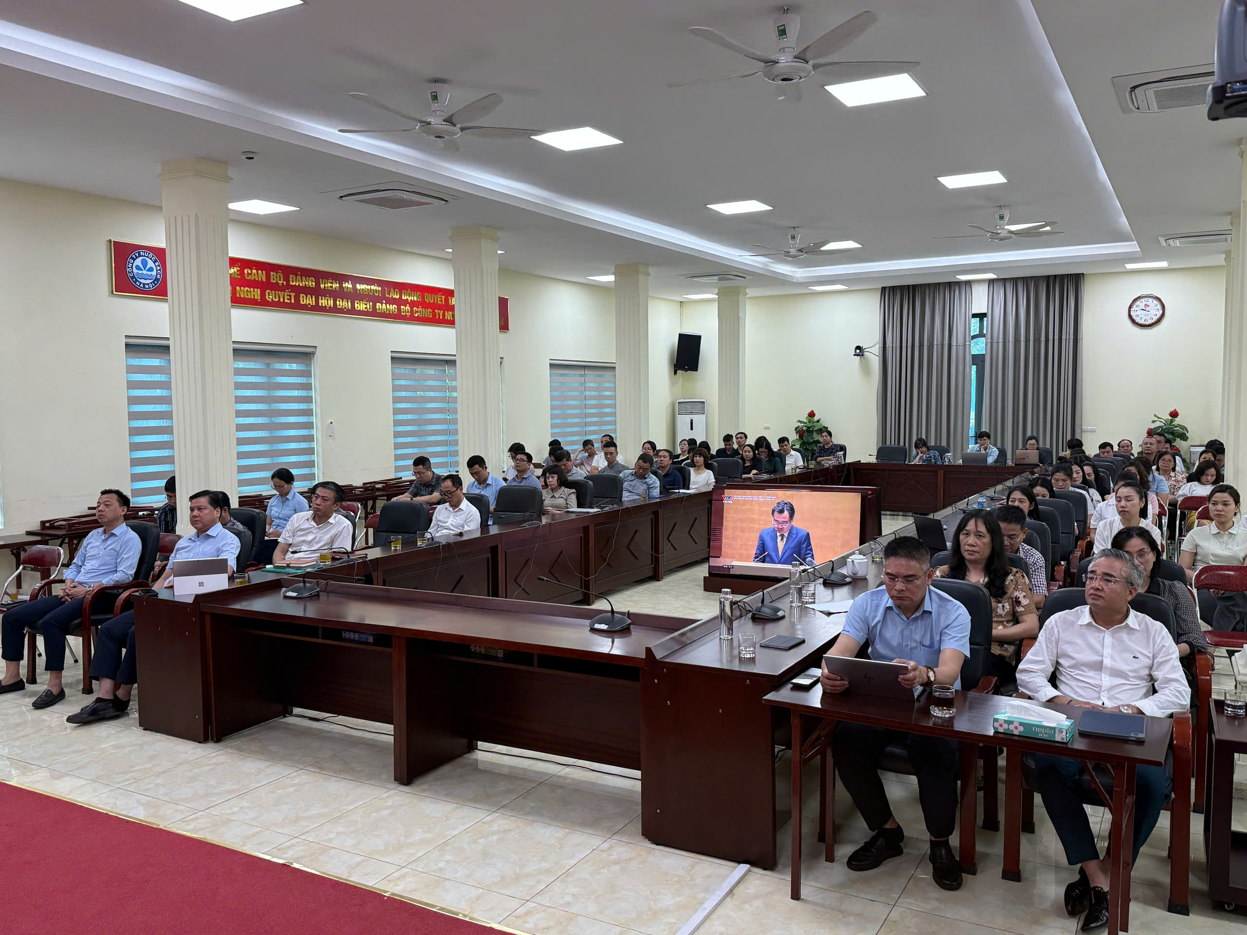 Thực hiện theo KH số 42-KH/BTGDVTW ngày 31/3/2026 của Ban Tuyên giáo và Dân vận Trung ương và KH số 54-KH/TU ngày 6/4/2026 của Thành ủy Hà Nội, sáng ngày 13/4/2026, Đảng ủy Công ty Nước sạch Hà Nội đã tổ chức chương trình tiếp sóng Hội nghị toàn quốc nghiên cứu, học tập, quán triệt và triển khai thực hiện Nghị quyết Hội nghị lần thứ hai Ban Chấp hành Trung ương Đảng khóa XIV và tổ chức Hội nghị của Thành phố quán triệt các chương trình hành động của Ban thường vụ Thành ủy triển khai thực hiện Nghị quyết Hội nghị lần thứ hai Ban chấp hành Trung ương Đảng khóa XIV theo hình thức trực tuyến